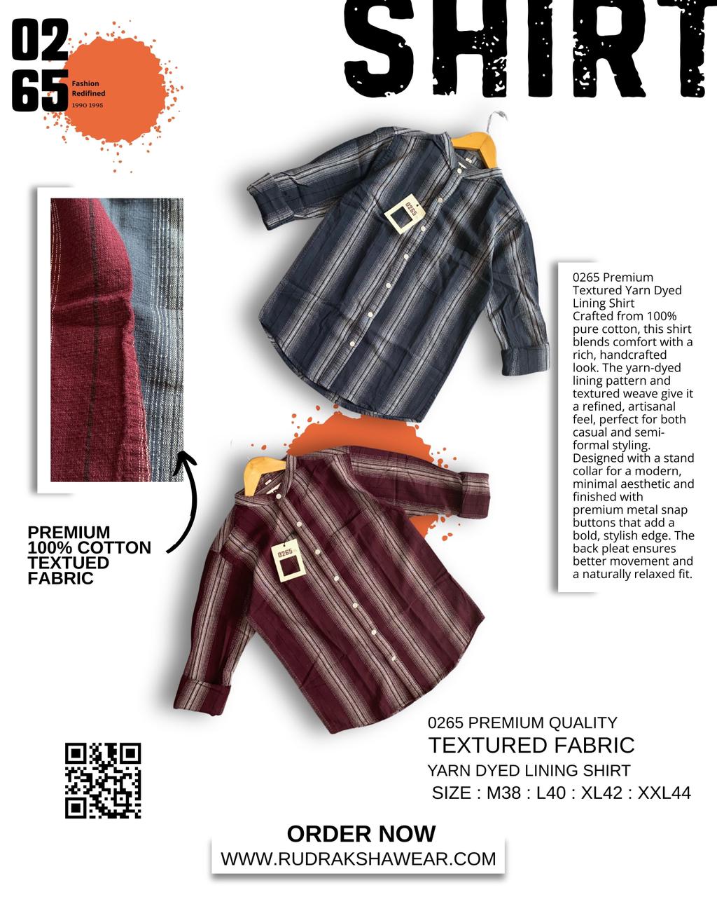 Elevate your everyday wardrobe with the 0265 Premium Textured Fabric Vertical Lining Shirt, crafted from Yarn Dyed 100% Cotton that promises unparalleled comfort, breathability, and long-lasting color quality. Designed with Vertical Lining Texture, this shirt delivers a visually elongated and structured look that enhances the body profile and adds a refined touch to your style.